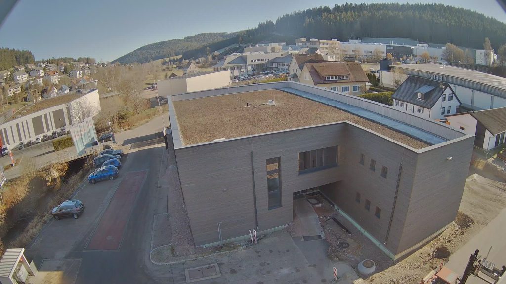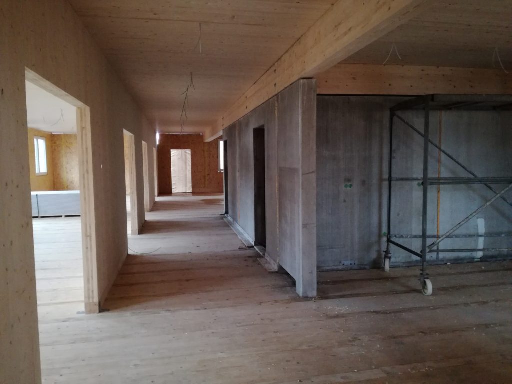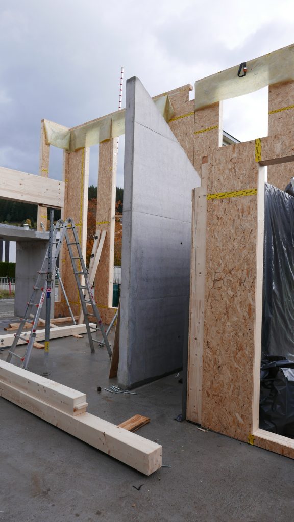 Das Gebäude wird in Hybridbauweise aus Holz und Stahlbeton errichtet und erfüllt den energetischen Standard KfW 70. Die Gebäudehülle ist als energieeffizienter Holzbau ausgeführt, während der Gebäudekern für Technik- und Sanitärbereiche als sichtbare Betonkonstruktion ausgeführt wird.