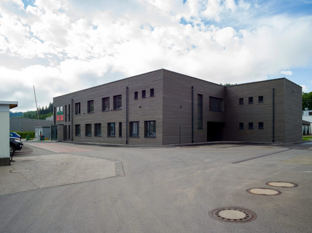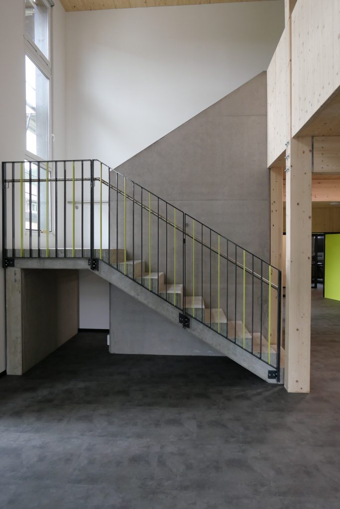 Mit dieser Bauweise werden die beiden Kernkompetenzen der Firma Herrmann – Holzbau und Stahlbetonbau – im neuen Verwaltungsgebäude bewusst sichtbar und architektonisch nachvollziehbar dokumentiert.